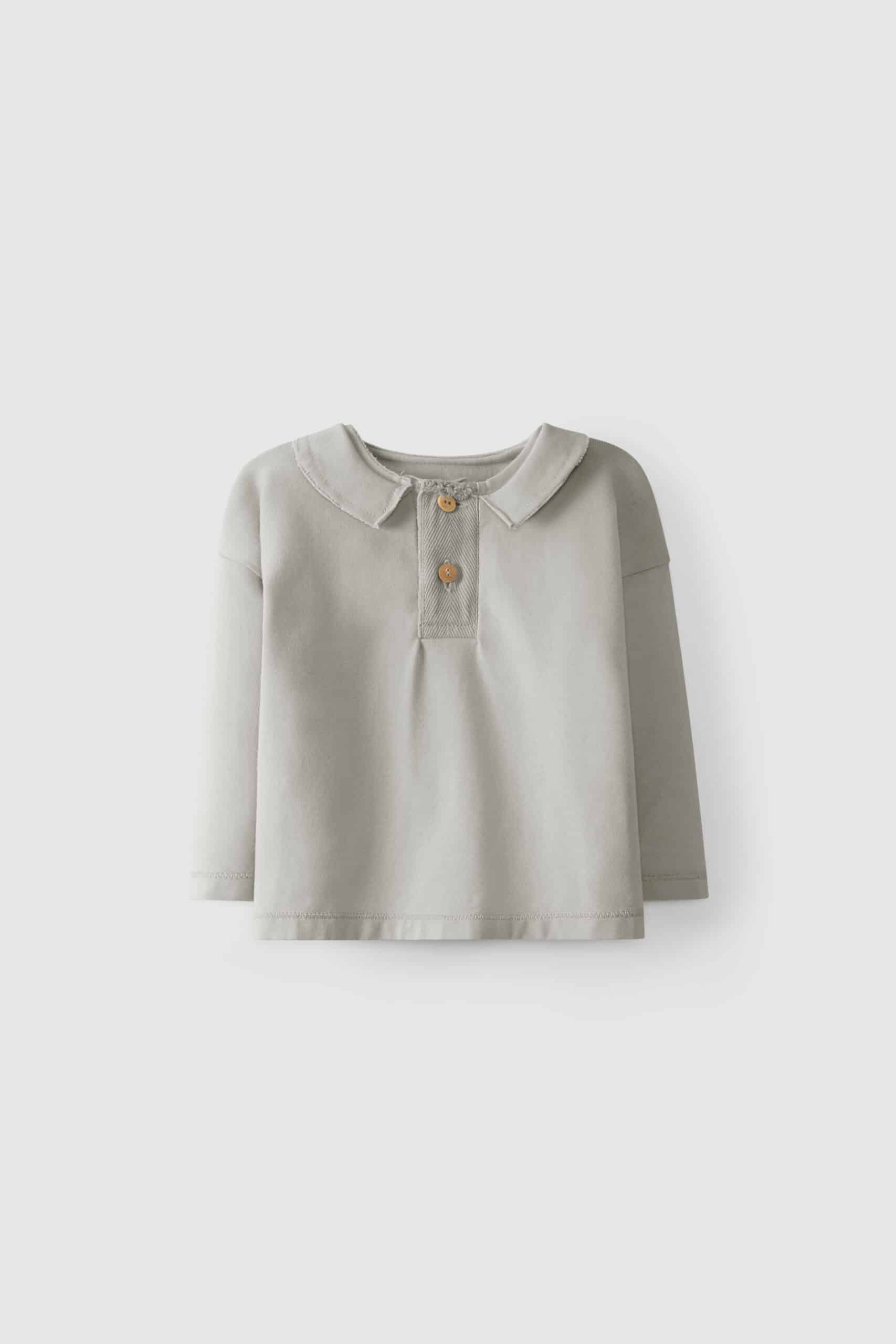 Snug longsleeve polo with pointy collar and 2 wooden buttons, 97% Organic cotton and 3% Elastane